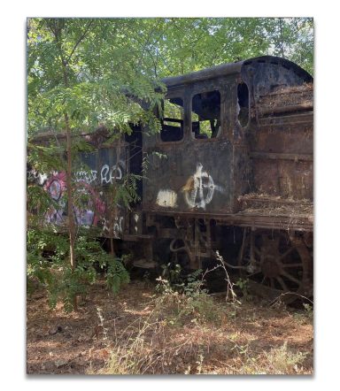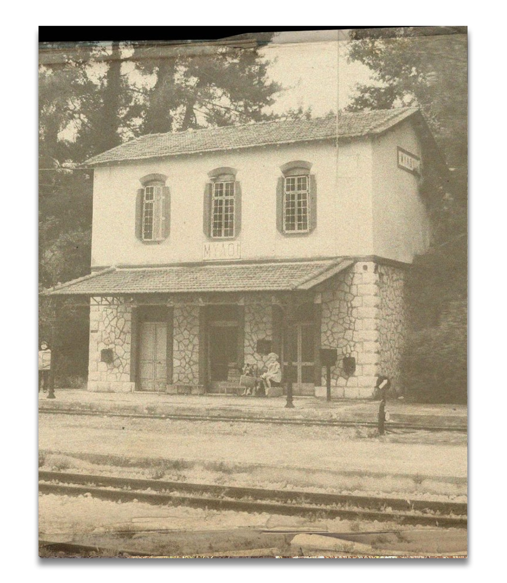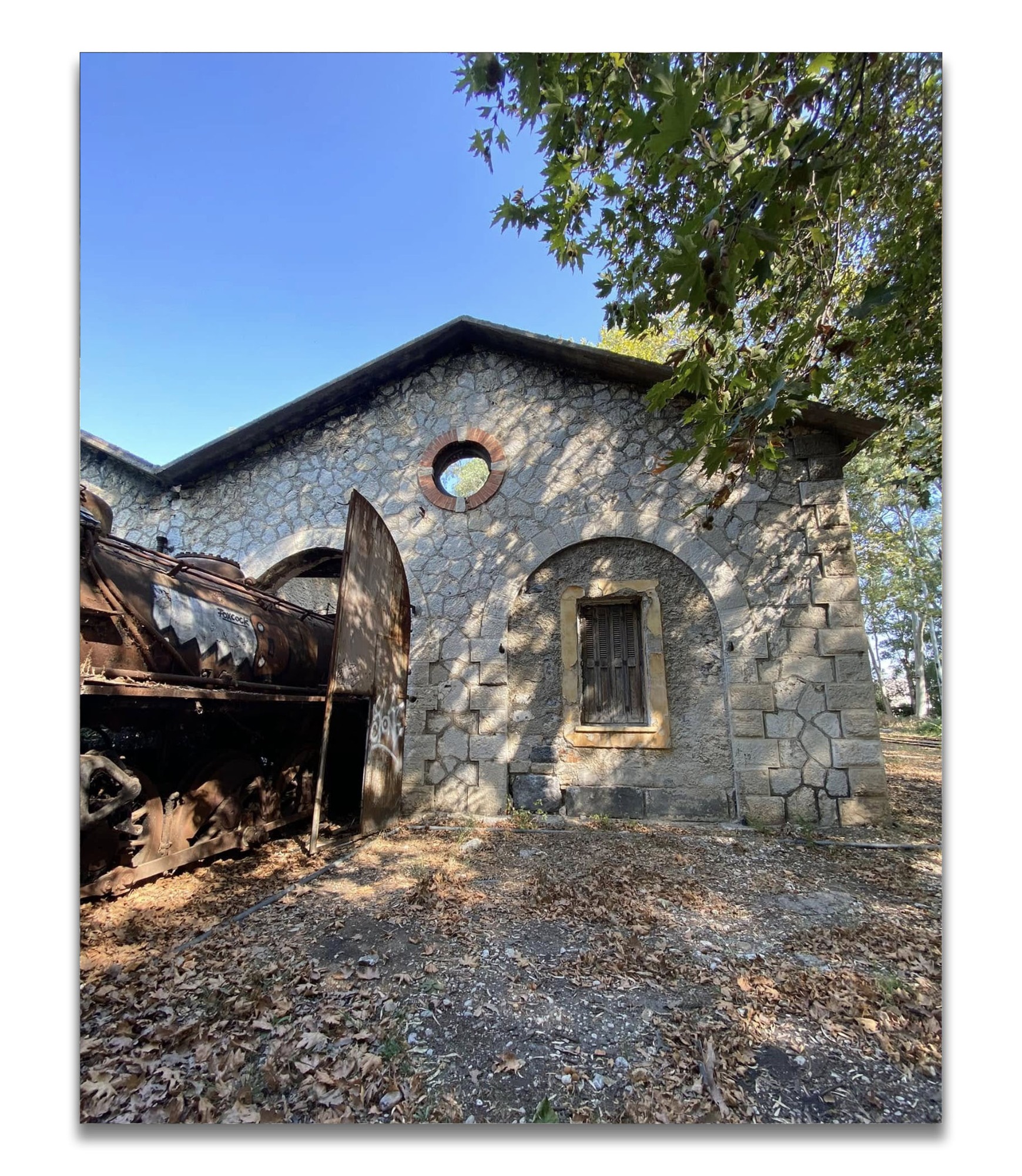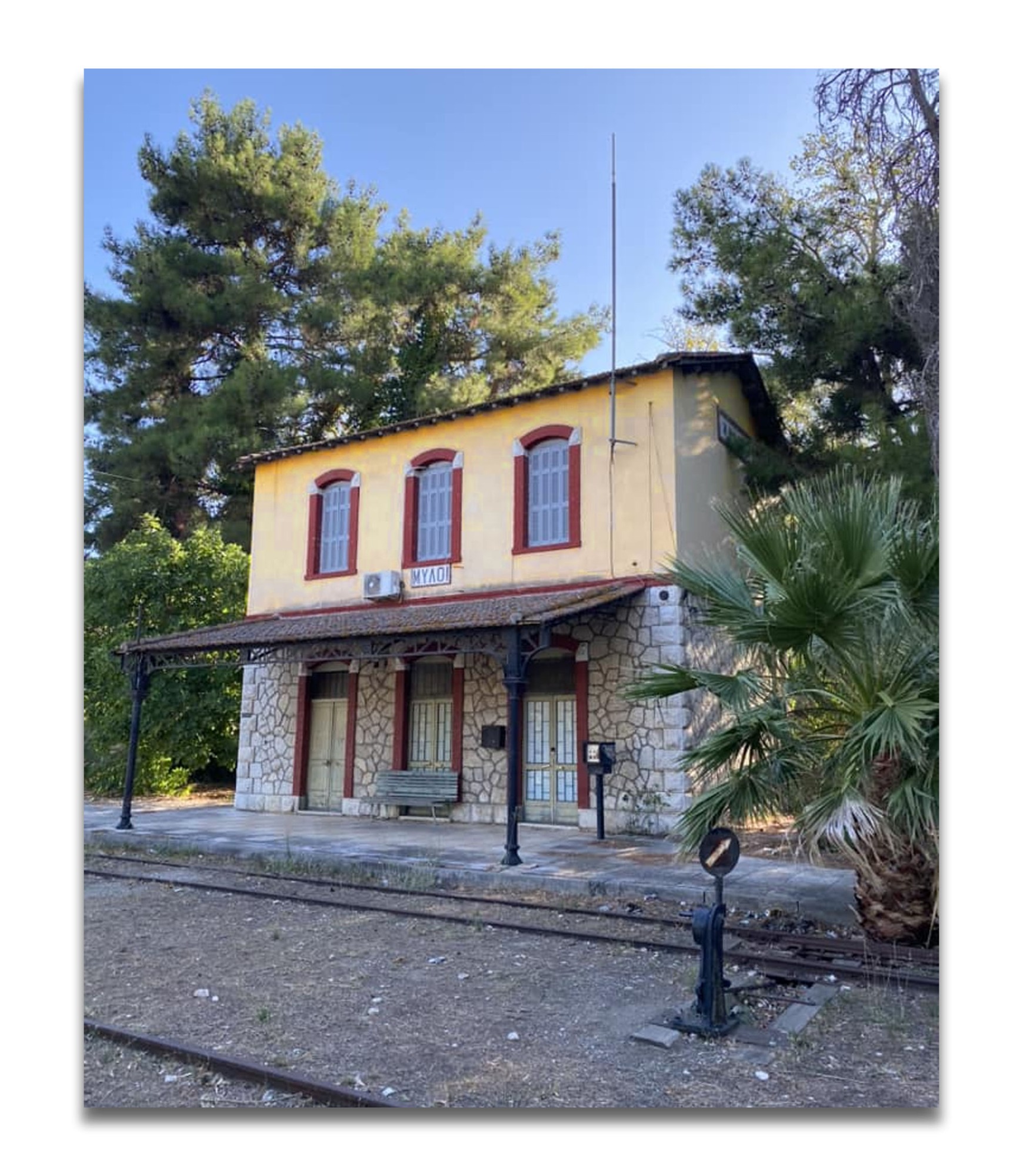 Het oude station van Myloi staat hier in de volle zon, met groene heuvels die zacht tegen het gebouw lijken aan te leunen. De warme gele gevel en de rode kozijnen geven het station een vertrouwde, bijna tijdloze uitstraling. Het dorp ligt aan een verlaten spoorlijn in de Peloponnese, wat de locatie een bijzondere rust en melancholie geeft.